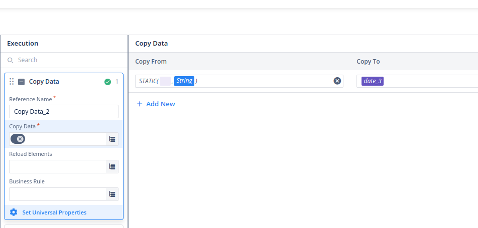 In the “Copy from” tab, pass the static( , string) function, and in the “Copy to” tab pass the entity.